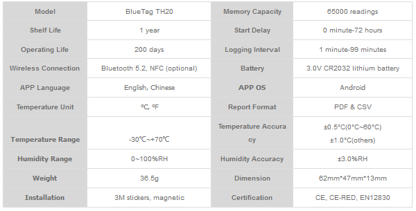 BlueTag TH20 HACCP Bluetooth Temperature and Humidity Data Logger through the Bluetooth App software provided by Xinlian, you can quickly and accurately set the parameters of the product. Through the APP Bluetooth connection, the temperature data can be read through the mobile phone APP. The Bluetooth temperature monitor has passed CE, CE-RED, and complies with EN12830 food transportation, storage and distribution standards.