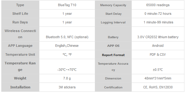 BlueTag T10 Bluetooth Temperature Data Logger Logger has passed CE, RoHS, and complies with EN12830 and HACCP temperature guidelines and requirements. It has a Bluetooth range of 10 meters, just scan the code through the mobile phone APP, any temperature change will notify you immediately.