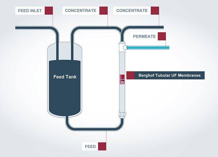 We at Berghof Membranes believe in external membrane filtration and it is the passion that drives us to “think outside the box” of membrane technology for wastewater treatment. The external filtration systems are positioned outside the bioreactor and utilize variable crossflow velocity to keep the membranes working at optimal conditions. If necessary, this process is supported with permeate backwash (temporarily reversed permeate flow) or chemical backwash protocols. Tubular membrane filtration is frequently applied for wastewater treatment in the external configuration because of the greater ease in cleaning, zero odor emissions and overall superior robustness.