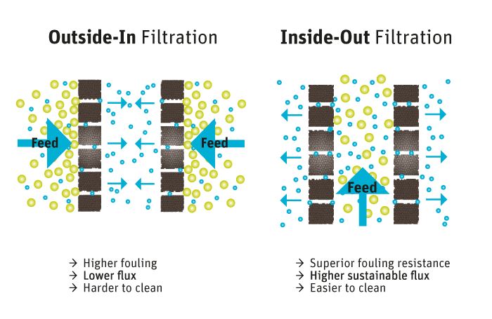 High cross-flow on the membrane´s surface prevents the build-up of particles on the inner surface of the tube, ensuring high flux and prolonged membrane lifetime.