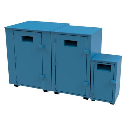 All our standard bin products boast solid welded steel construction, ensuring durability and longevity. They are coated with an epoxy primer before receiving the topcoat for color. While we offer standard blue and black colors, we are also open to accommodating special requests for color matches.