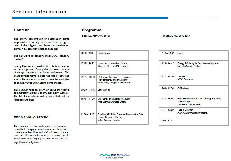 This seminar is primarily aimed at suppliers, consultants, engineers and investors. Also welcome are universities and staff of research centers and all those who want to acquire special know-how about desalination markets.
