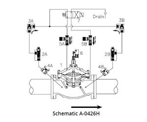 The 106-BPC and 206-BPC booster pump control valves are installed in-line, directly downstream of the pump discharge. The pump control valve is normally closed and on pump start-up, a pilot solenoid is energized to open the valve, at a rate governed by the opening speed control. When shut-down is required the pilot solenoid on the valve is de-energized to commence closing. The pump is kept running while the valve slowly closes. When the valve is almost fully closed and flow is virtually zero, a stem mounted cam triggers the limit switch to stop the pump.