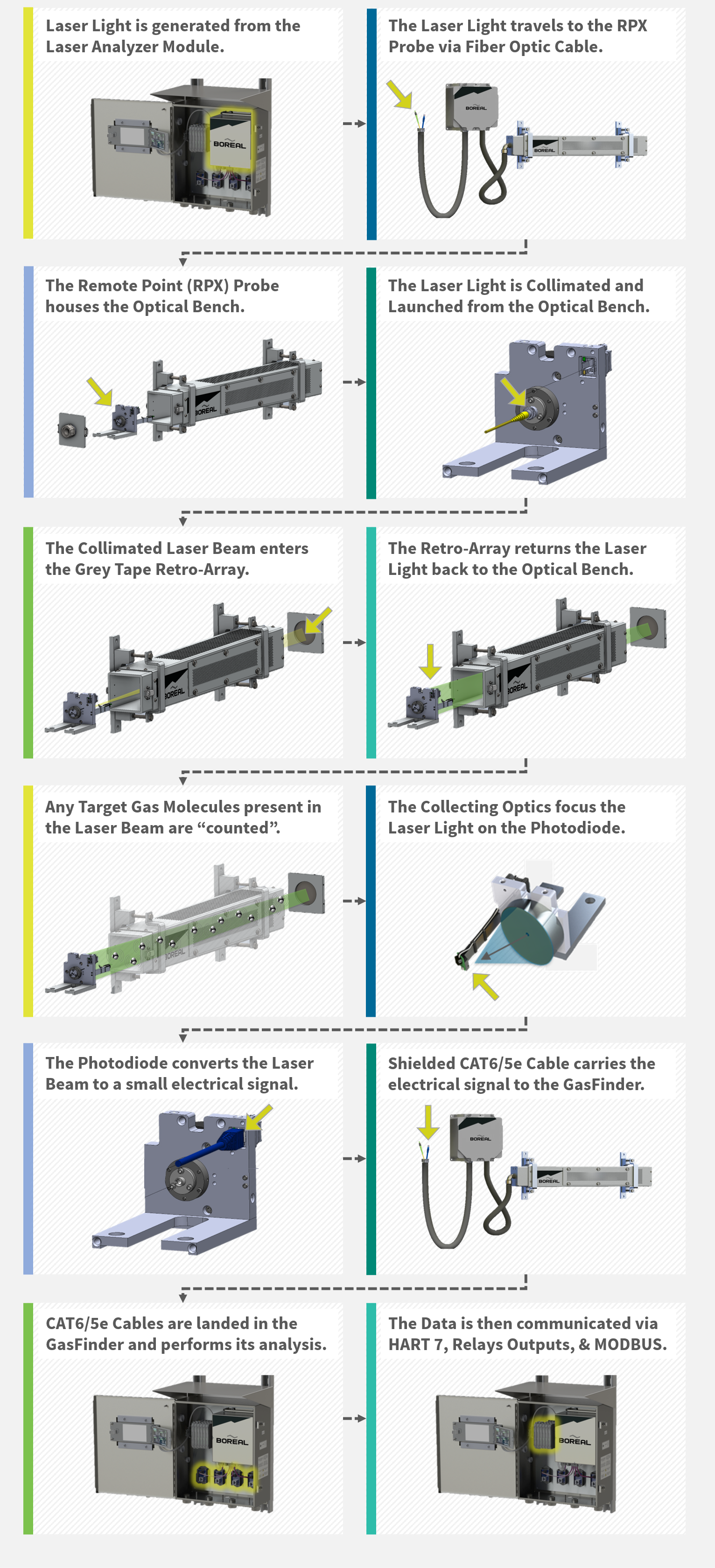 Used for Point Gas Detection: Laser Based - Fixed Point Gas Detection. Use in Hazardous Area Applications: (A)Ex ib IIC T5 Tamb less than 70°C Gb (C1 Div1, G: A,B,C,D). No Poisoning, Flooding, or Fouling: No consumable measurement sensor. Remote Measurement Head: Paired with one of our GasFinder3 Instruments. When combined with one of the GasFinder3 Analyzers, it creates a Laser Based – Fixed Point Gas Detection measurement for applications that require fast speed of response or immunity to poisoning/fouling.