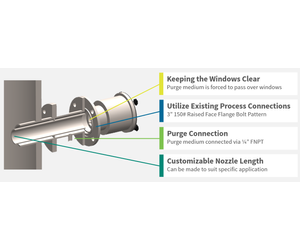 The design of the Purge Insert forces the purge medium past the windows of the Stack/Duct (SDX) Probe and the Retro-Flange to keep the windows both clean and cooler.