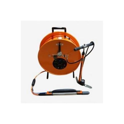 The borehole geophone BGK3 is used to receive P- and S-waves in dry or water filled boreholes. This geophone can be mainly applied for crosshole tests using the BIS-SH S-wave source and the generator IPG5000 and downhole tests with a Sledge Hammer. The borehole geophone BGK3 consists of a tri-axial sensor whereas the BGK7 consists of six horizontal sensors, separated by 30° intervals, and one vertical sensor. The geophone is coupled to the borehole wall by a pneumatic clamping system (inflatable bladder). Air is supplied to the BGK3/7 through an electro-pneumatic hybrid cable with a Kevlar tension string. A magnetic compass shows azimuthal deviation to North and can be used to get the orientation of the geophone in the borehole. The cable is terminated by a connector to the seismograph.