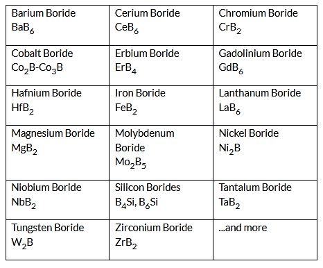 A number of industrial and commercial users find boride compounds suited to the following technical applications due to their dependable qualities including: