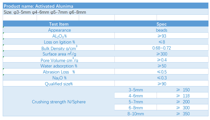 Activated alumina has many capillary channels and a large surface area, and can be used as an adsorbent, desiccant and catalyst. It is also determined by the polarity of the adsorbed substance. It has a strong affinity for water, oxides, acetic acid, alkali, etc. It is a micro-water deep desiccant and an adsorbent for polar molecules.