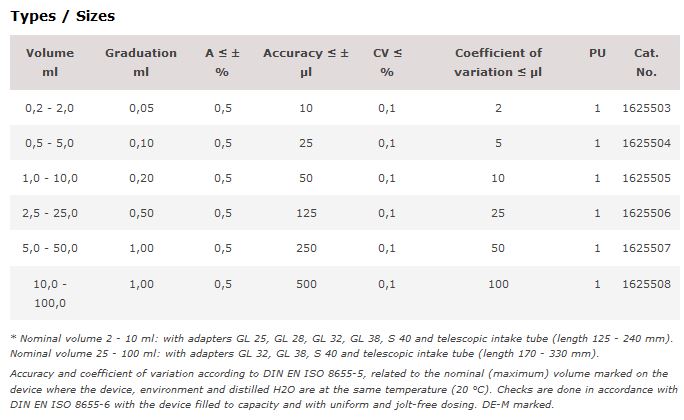 The dispenser are equipped with a positive displacement piston and a fluoroplastic (PFA) sealing lip on the cylinder wall. This latter acts like a windscreen wiper to prevent crystal build-up on the cylinder wall from readily crystallisable media. The glass cylinder is also coated with a plastic material that reduces the risk of splashes should breakage occur. The telescopic filling tube can be adjusted smoothly to different bottle heights.