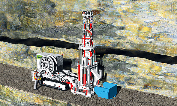 Thanks to its compact design, the BBM can also be used under space constraints in gold, copper and other underground ore mines. The spectrum of application ranges from the excavation of ventilation shafts to the creation of ore passes for conveyance from the production level to the transport level. A crawler transports the machine quickly from one drilling location to the next. This mobility advantage and the high excavation performance contribute to significantly reduce the time required per completed raise or shaft, in comparison to conventional methods.