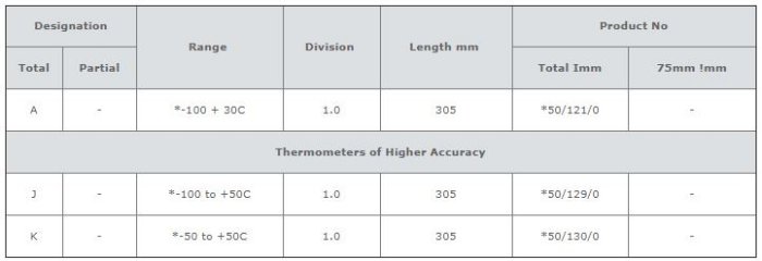 BS 1704 : 1985 is identical to ISO 1770 - 1981 (revised in 1983). The specification includes standard thermometers (designation A to H) and thermometers of higher accuracy (designation J to W). Thermometers with ranges below -35°C are red spirit filled. The designation reference for partial (75mm) immersion types is suffixed “/75”.