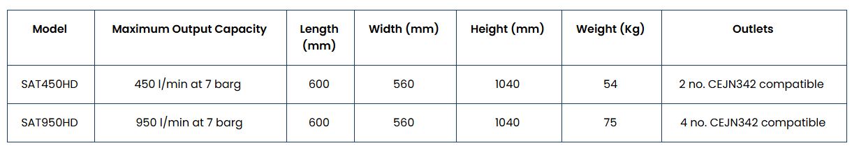 The SAT450HD and SAT950HD are breathing-air purification systems for those working in areas where there is a risk of higher than normal levels of carbon monoxide or carbon dioxide being ingested into the compressed-air system. They also ideal for use in the outside environment, where the conditions of usage are not known and in accordance with EN12021, the pressure dewpoint should not exceed -11°C. Both units incorporate compressed-air filtration and drying systems which deliver a smooth, controlled, uninterrupted supply of breathing quality air far exceeding the requirements of EN12021 and a range of international standards. Built to last the units are mounted within a tough polyethylene housing. With virtually no ferrous components the unit incorporates stainless and aluminium components making it suitable to be used in tough and arduous environments. The stainless steel wheeled frame allows the unit to be easily manoeuvred into position.