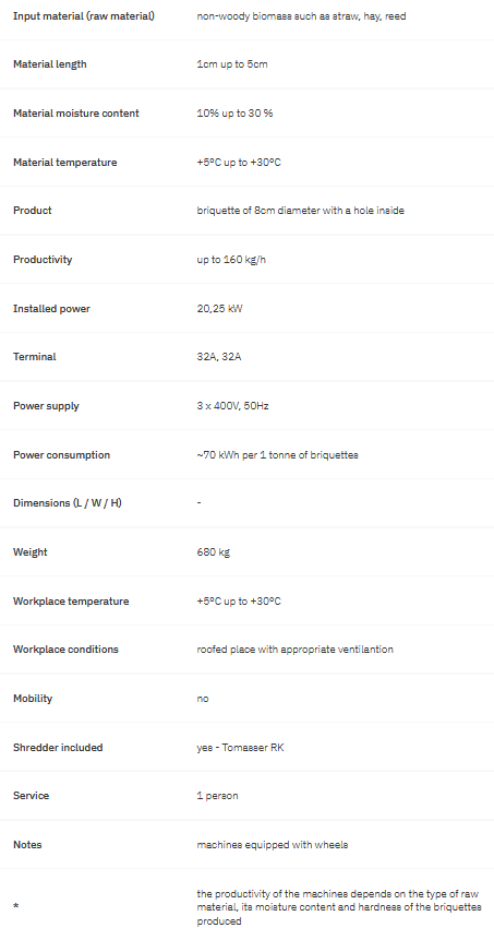 Biomasser Duo-Set is a small, complete set of machines for straw briquettes production composed of briquetting machine Biomasser Duo and straw shredder Tomasser RK . The set is designed for individual users and small farms for the production of briquettes for their own needs and the needs of the local community. Surplus briquettes can be sold on the local market.