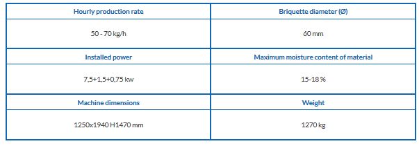 The FORCE 60-70 of briquetting press consists of a single element on which a mini silo, expulsion mechanics and hydraulic control unit are mounted. This solution offers many advantages due to the limited amount of space it occupies. The machine has been designed for customers who do not need to process a large amount of material but who nevertheless demand a high quality briquette for either commercial purposes or their own personal use. A wide range of accessories is also available to customize the machine to every client’s individual needs.