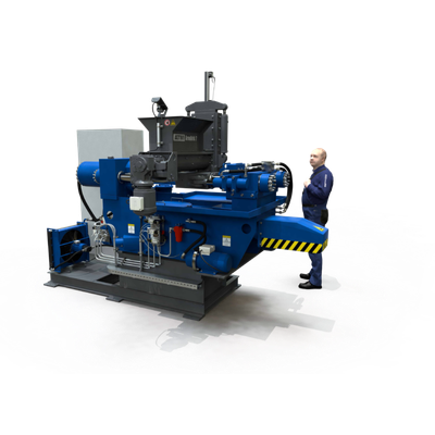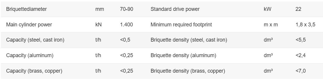 Enormous reduction of wear in the press box: The movable tool frame compensates for relative movement during the compression phase. High-density briquettes: Excellent transport and melting properties thanks to high briquette compression. 2-column technology: Maximum variability in tool unloading. The columns with patented locknuts handle millions of compression cycles at full load. Compact design: Minimal space requirement due to the compact machine design.