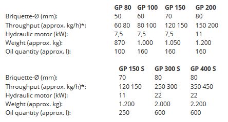 GP series briquetting presses are especially robust and handle all briquetting materials such as wood shavings, wood chips, paper, different types of cardboard, Styrofoam, straw, hay and many other homogenous materials. They are easy to maintain, convincing due to low operating cost, and can compress a great variety of materials. Therefore, the GP series is the first choice for the wood processing industry.