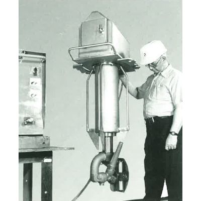Model M-8A delivers a speed and position controlled jet stream for cleaning all interior surfaces of tank cars or similar containments. M-8A Control provides cam-following speed control on both axes. When tank top and side walls require effective jet-cleaning, look to the Model M-8A. Additional information on request.