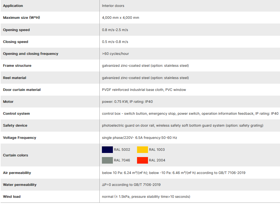 High opening and closing speed to allow smooth traffic flows of personnel and material/equipment. Short open time and tight seal reduce air flow to save energy. Protect against bad weather and dust-free. Curtain can be replaced separately with low maintenance costs. Equipped with safety devices to protect personnel and material/equipment.