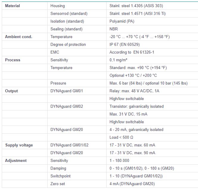 The DYNAguard technology is based on a modified triboelectric principle detecting particles interacting with the sensing rod and such particles just passing the rod. Build up on the rod surface will not be detected, only moving particles generate a flow rate proportional signal which is monitored by the electronics. Three electronics versions are available with analogue (GM20), relay (GM01) or transistor (GM02) output. Adaptation is done under normal conditions by switches and potentiometer, DYNAguard's alarm level (GM01, GM02) can be set above this background. Signal damping is selectable by the user.
