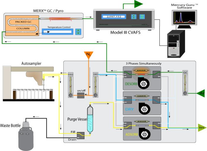 The released Hg species are separated on a GC column and then thermally reduced to elemental mercury.
