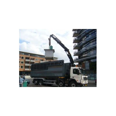 37 cbm capacity. Crane cutout in front and rear side of the container. Rear top-hinged tailgate covering half of the rear. Depository for crane clamp on rear. Special door lock. Central lock with ratchet operation from side. Centrally divided netted door opens hydraulically or with rack-and-pinion drive. Interior top-hinged flap for subdividing the container. All metal sheets made of highly wear-resistant Hardox material.
