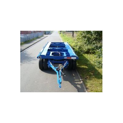 BRUNS container trailer for transporting roll-off containers according to DIN 30722. Container trailer fitted with 8 tyres. Roll-off container load securing via a pneumatic 4-point claw lock. Trailer has KTL + powder coating.