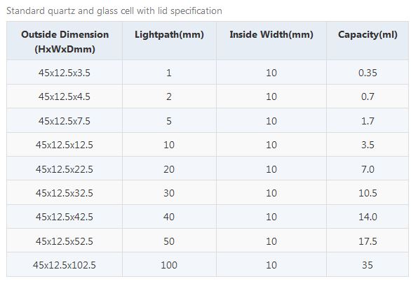 Spectrophotometer cells with lid, 2 windows polished, body height=45mm, with round bottom(default option) or level bottom. It`s standard cells with lid, suitable with most brand spectrophotometers. Standard rectangular cell with lid, Macro cells with ptfe lid, Absorption Cells, two windows polished