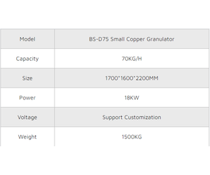 BS-D75 small copper granulator is a highly cost-effective machine with high accuracy. Capacity is about 70KG/H, small size simple structure which occupies a small space and reduces your investment. It is suitable for recyclers with low investment and small quantities of scrap cable wires. CONTACT US Whatsapp: +86 137 7250 8206 email: coppergranulator@bsghrecycling.comBS-D75 is a hot-selling small copper granulator machine in BSGH. Although our BS-D75 is small and cheap, but the purity of final copper is as clean as big capacity machine and middle capacity machine.