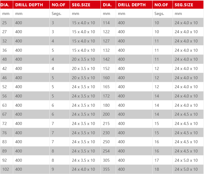 - Segment length 24mm/0.935” Working length 400mm/16” Segment width 3-5.0mm/0.118-0.165” Over length 450mm/18” We can manufacture wet diamond core drill bits according to customer required sizes.