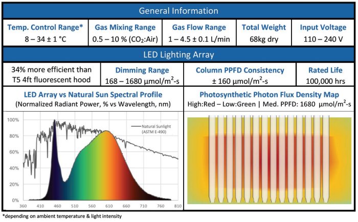 The MBE Bubble Column Array PBR features fourteen 800 mL glass column reactors, allowing for multiple simultaneous experimental conditions. The simplicity of the design allows for manageable operations and the large volumes allow for dry weight measurements. The energy efficient LED has a maximum light intensity of 1,600 μmol/m²-s, dispersed evenly across the width of the array for reproducible experiments. An integrated temperature controlled water bath allows for a wide range of culture temperatures (8-34°C).