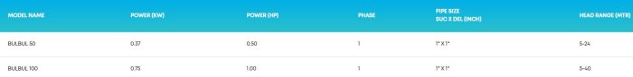 Suction Lift: Up to 6 meter. Motor Rating: 0.37-1.10 kW (0.50-1.50HP). Supply Phase: Single Phase. Pipe Size: 1" X 1". Head: Up to 40 Metres. Discharge: Up to 2850 LPH.