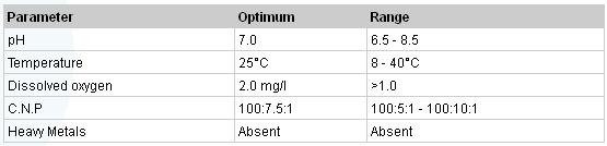The product is added as a dry powder directly to the aeration basin at a point giving the maximum possible rapid mixing and dispersion throughout the mixed liquors. The product is most effective when the operating conditions in the treatment plant are close to the optimum conditions listed below: