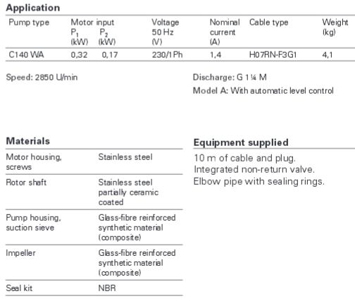 DIN EN 12050-2: Conformity and design approved and controlled by LGA. Installation: Permanent or transportable. Model with float switch control for automatic pump operation, depending on liquid level in the sump. Float switch fixation for continuous operation mode. Pumped liquid: Clear water or drainage water containing soft solids up to 10 mm spherical clearance. Max. liquid temperature: 35°C, short term up to 60°C. Operation: Permanent.