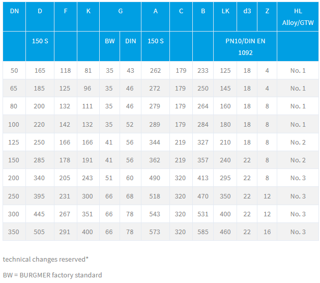 - Face to Face length: BURGMER-factory standard, EN 558-1 line 20