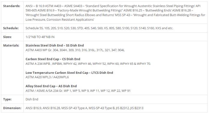 JF Engineering Products LLP maker and exporter of ASME/ANSI B16.9 Buttweld dish Cap pipe fittings available in different structures and size, items like Elbows,Tee, Cross and reducers etc. Buttweld fittings are those fittings which is used in a piping scheme to modify the direction, change pipe diameter or for branching. Buttweld fittings measurements, dimensional resiliences are characterized in the ASME B16.9 guidelines. Light-weight consumption safe fittings are made to MSS SP43.We additionally offer hand crafted Buttweld dish Cap that have been generally valued by our customers. ASME B 16.9 Buttweld End dish cap Pipe Fittings standard covers pressure-temperature ratings, materials, dimensions, tolerances,marking, testing, and methods of designating openings for fittings. Buyers can purchase varieties of grades with different materials such as Stainless Steel ASTM A403 304, 316L, 317L, 321.