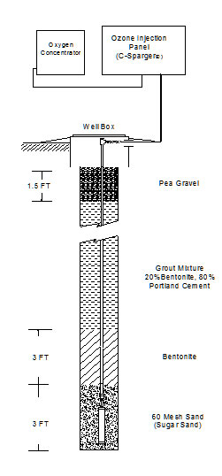 The ozone sparging process (C-Sparge™) employs nano- to micro-sized bubbles of air encapsulated ozone created by injecting an air-ozone mixture through invisible pores in KTI’s Spargepoints. Pressure-pulsing the microbubbles of air/ozone through soil and groundwater yields rapid clean-up of a host of contaminants by means of in-situ chemical reactions that leave only water and beneficial oxygen as byproducts: O3 + 2H+ + e- ? O2 + 2H2O