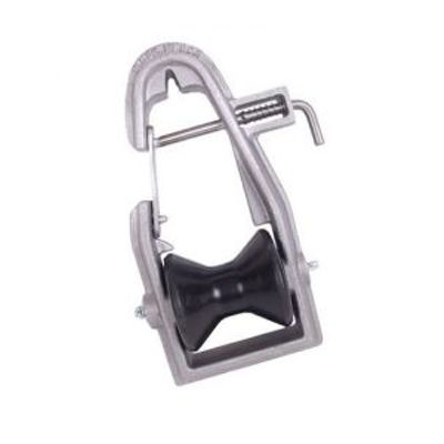 This economical block has a rubber roller and is used for new strand and overlash work. Can accommodate up to a 2 in. (5cm) cable. The strand wedges in the “V” notch of the sturdy cast aluminum frame. The spring-loaded strand retaining pin will clear two previously lashed 3/4 in. (19.05mm) cables for overlashing. A rotating gate keeps line or cable on the roller.