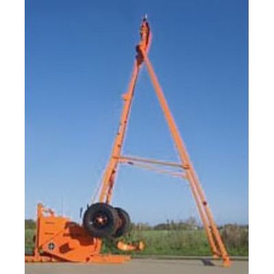 The Cable Percussion / Shell and Auger Rig folds flat in transit, making a trailer approximately 9m long. The rig is towed by a `Land Rover` type vehicle.