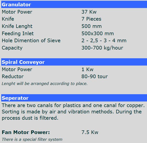 Cable recycling system made up of 4 units. In the cable granulator system, cable has been reduced as granule, afterwards granule brings to sorting unit via conveyor to separate as copper and plastic. The dust of granules is filtered by air filter. Capacity has been reached to 300-700 kg/h. Approximately, sorting rate of product as copper and plastic is % 99,5. You don`t need qualified staff to operate of machine. You need one person to operate of machine.