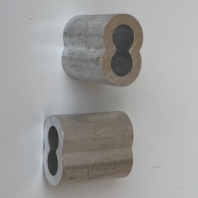 These aluminum hourglass sleeves are crimped to join two cables. For construction of oil containment boom and silt curtains, these sleeves are used in pairs to form end connector loops on cables. The cable is fed through the two open channels in the sleeve, and a crimping tool is used to sqeeze the sleeve tightly around the cable, fastening the two cables together. 1.25 in x 1.06 in x .69 in with .36 in inner diameter channels -- suitable for 5/16 in cable. These hourglass sleeves are sometimes referred to as farrules.
