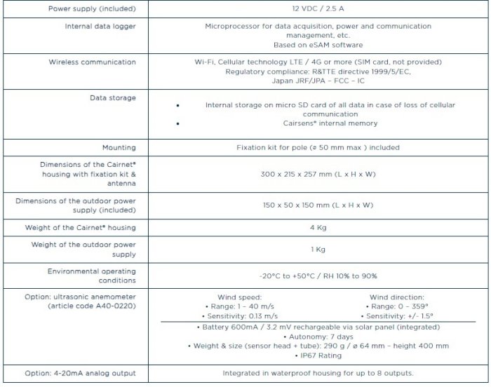 Cairnet® DATA+ is a real-time air quality monitoring station including up to six Cairsens® micro-sensors. It also monitors environmental parameters such as wind speed and direction, T°C, RH% and Pa. The device has been designed to leverage local communication and features main power supply as well as cellular communication. It can acquire data from complementary sources such as “all in one” weather stations, noise sensors, etc. Cairnet® DATA+ can be easily connected to our cloud solutions or customer software plateform by using APIs.