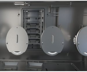 Integrated to the back wall of an isolator – in this configuration, Tray Dryer size restrictions may apply due to the ergonomic challenges of working through Gloves. PSL’s expertise in designing containment isolators will guide you through these aspects.