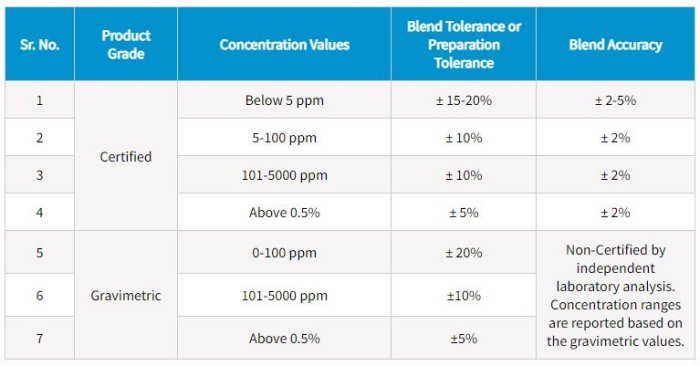 These multi-component gas mixtures which are a part of wide range of specialty gases are available in a wide range of concentrations upto ppb levels. They come with a certificate of analysis from CSL’s Mumbai facility. Method of preparation follows the ISO 6142 and method of analysis follows the ISO 6143. This certification confirms their suitability for demanding applications which require the highest levels of accuracy.