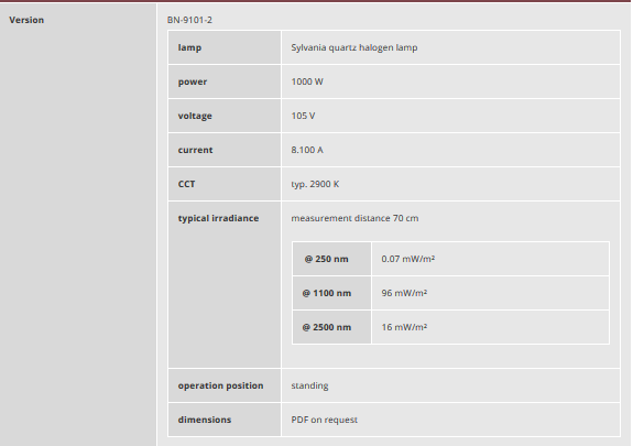 In the short wavelength spectral range, the 1000W quart halogen lamp from Osram Sylvania provides a lower UV irradiance level compared to the BN-9101-1 version. As a result, this model has a longer and stable lifetime.