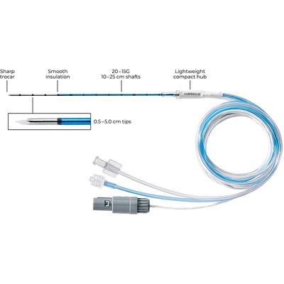 Size options for many ablation applications. Sharp tip reduces need for skin incision. Low profile hub reduces hand fatigue and improves anatomical clearance.
