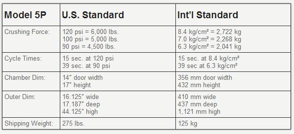 Model 5P RAM FLAT Compactor can reduce the volume of most containers by up to 90%! At 120 psi, a 17-inch tall 5-gallon pail becomes a 2.5 inch pancake while a 12-inch 1-gallon can is reduced to only 1 inch.