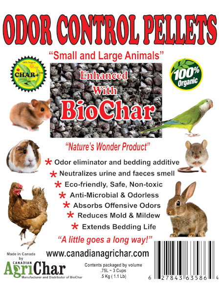 Odor Control Pellets by Canadian AgriChar absorb offensive odors caused by pets, farm animals, or any other source of smell. Reduces Mold & Mildew, Anti-Microbial & Odorless, Extends Bedding Life, Eco-friendly, Safe, Non-toxic, Odor eliminator and bedding additive, Neutralizes urine and faeces smell.