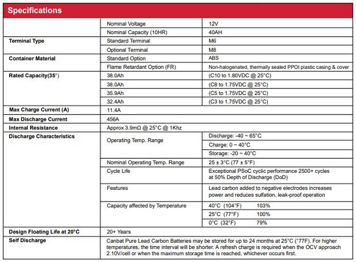 Canbat - Model CLC40-12FT -12V 40AH Pure Lead Carbon Batteries