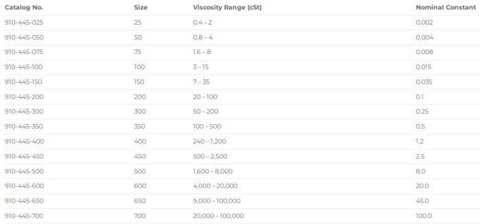 - Viscosity Range: 0.8 to 4, 0.4 to 2, 1.6 to 8, 3 to 15, 7 to 35, 20 to 100, 50 to 200, 100 to 500, 240 to 1200, 500 to 2500, 1600 to 8000, 4000 to 20000, 9000 to 100000, 20000 to 100000