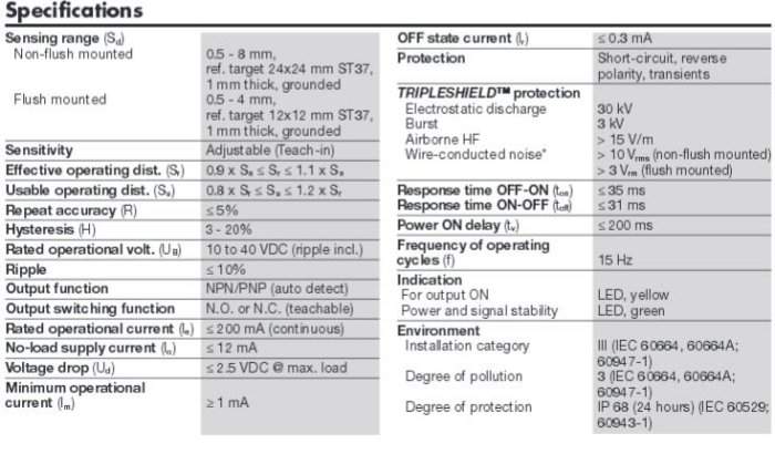 Capacitive proximity switches with a sensing distance of either 4 rnrn flush mounted in metal or 8 mm non-flush mounted. The switching points can be altered by means of the teach-in function. 3-wire DC output with selectable make (NO) or break (NC) switching and NPN Alarm. Grey polyester housing with 2 m PVC cable or Ml2plug.